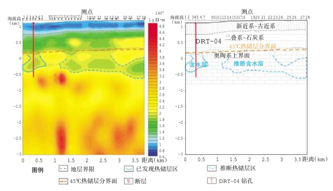 DRT-04孔位于L2线4号点附近,深部地热取水层位为650~995 m,从该点的电性角度分析,含水层主要位于奥陶系上段灰岩中的中低阻区域,电阻值一般在60~200 Ω·m。新近系古近系及二叠石炭系里有巨厚的砂泥岩互层,岩石热导率低,构成了良好的盖层;下覆奥陶系上部地层在垂向上出现灰岩、白云岩、页岩互层或夹层的反复变化,造就了地热水形成和赋存较为有利的热储条件。