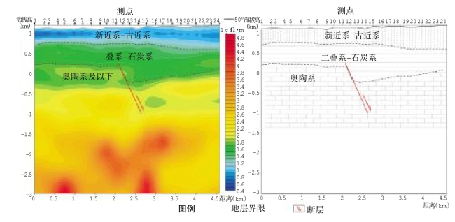 L2、L3剖面由上及下均呈现低、中、高三层电性结构特征。第一电性层视电阻率一般小于10 Ω·m,地层主要为第四系,新近系—古近系,岩性以砂岩、泥岩为主;第二电性层视电阻率一般在10~100 Ω·m,主要为二叠系—石炭系地层,岩性以砂岩、粉砂岩、泥岩为主;第三电性层视电阻率一般在100 Ω·m以上,主要为奥陶系及其下部地层组。
