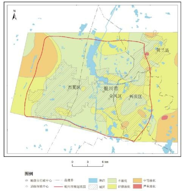 银川市内大部为堆积平原,西侧发育部分山前洪积扇及扇前洼地,风积和冲湖积堆积着全新世巨厚的粉细砂和粉土。加之地下水位埋深一般小于2 m,这些浅层较为松散的粉细砂多处于饱和状态,加之堆积时间短,上覆压力小,密实度低,在地震或其他动载荷作用下,很容易产生砂土液化现象,致使地基失稳造成损害。根据《康熙宁夏府志》和《银川小志》记载,1739年平罗大地震时,银川一带曾发生喷水冒砂,城垣沉陷破坏现象,地震产生的次生砂土液化灾害造成大量房屋倒塌、人员死亡的重要原因。这些历史记载不仅说明银川地区存在砂土液化发生的条件,而且历史上也出现过砂土液化不良地质现象。经调查研究,银川市的砂土液化严重,主要分布在东西两个区域(见图7-4)。