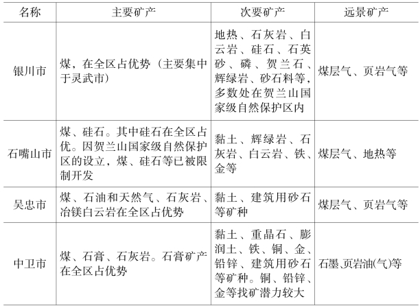 区内已发现各类矿产35种(含亚矿种),其中能源矿产5种,主要为无烟煤、烟煤、石油、天然气、地热(水);金属矿产11种,有铁、锰、铜、铝、铀、铜钴、多金属矿、岩金、砂金、银、镁(冶镁白云岩);非金属矿产18种,包括冶金辅助非金属原料矿产(包括溶剂用灰岩、白云岩、石英岩、铸型砂、耐火黏土)、化工原料非金属矿产(硫铁矿、电石用灰岩、制碱用灰岩、磷块岩)、建材原料非金属矿产(石膏、石灰岩、玻璃用石英砂、玻璃用砂岩、陶瓷黏土、水泥配料用黏土、建筑用辉绿岩、饰面用大理岩、水泥配料板岩);矿泉水等。