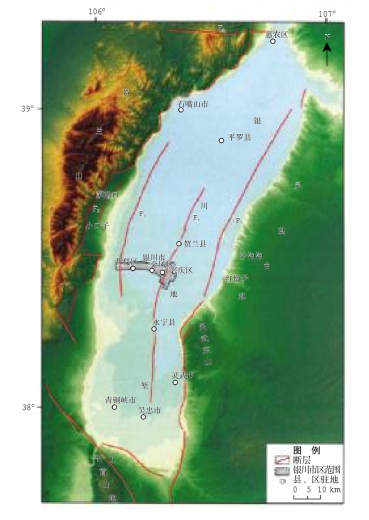 银川盆地是典型的新生代断陷盆地,夹于贺兰山构造带与鄂尔多斯地块之间,总体走向北北东向,南北长逾180 km,东西宽约60 km(图9-1)。银川断陷盆地中发育了4条北北东向断裂,从西向东分别是:贺兰山东麓断裂、芦花台断裂、银川断裂和黄河断裂。