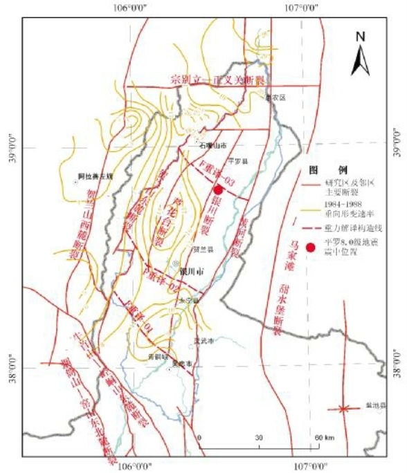 图9-12 区域重力解译断裂及垂向大地形变特征对比图