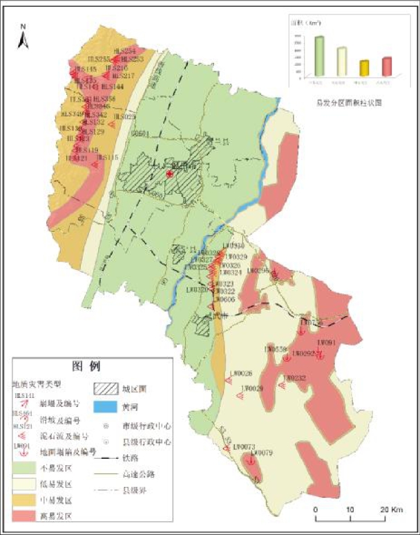 地质灾害中易发区主要分布在高易发区外围,共计分布面积1037.548 km2。主要为地面塌陷和泥石流的影响区和地质环境条件差、地形高差大、易产生地质灾害现象但基本无人类活动的区域。