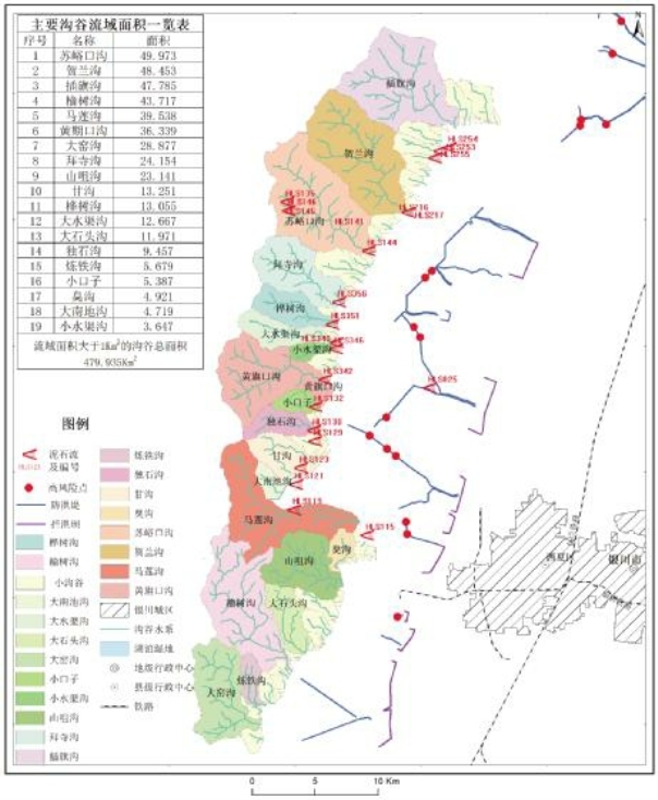 图10-2 银川市西部泥石流、洪水沟谷及其防治体系分布图