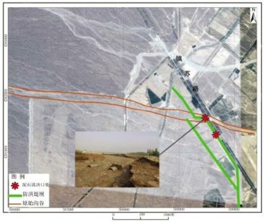 图10-3 2016年银川镇北堡泥石流冲毁防洪堤坝图