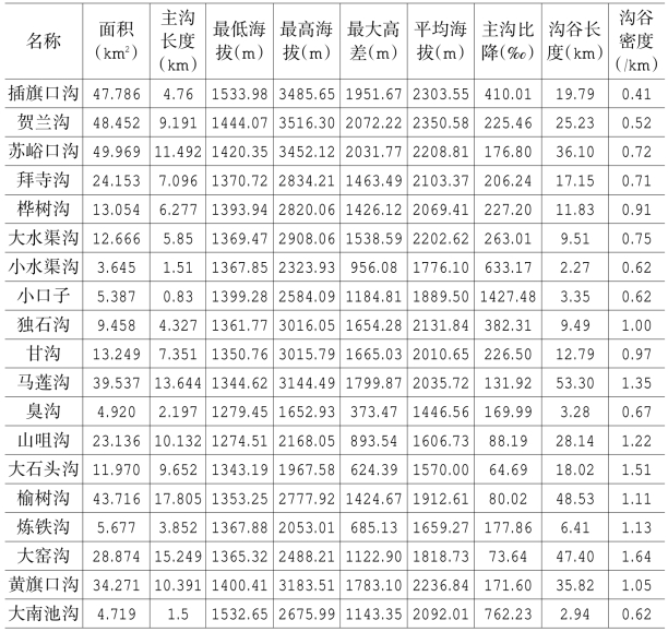 通过遥感解译和水文分析,发现银川西部共分布着苏峪口、贺兰沟、插旗口沟、榆树沟等19条主要沟谷,其中以苏峪口流域面积最大,为49.975 km2。流域面积大于1 km2的沟谷38条,总面积达474.385 km2。19条主要沟谷的参数见表10-1。
