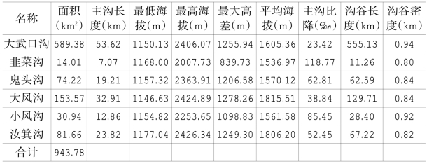 通过遥感解译和水文分析,发现对该区有重要影响的沟谷有大武口沟、韭菜沟、鬼头沟、大风沟、小风沟、汝箕沟等6条沟谷,分析计算出各沟谷的面积、主沟长度、高差、主沟比降等沟谷参数。这六条沟谷流域面积总计达943.78 km2,占整个宁夏境内贺兰山面积的一半,其中大武口沟是贺兰山中面积最大的沟谷(表10-2)。