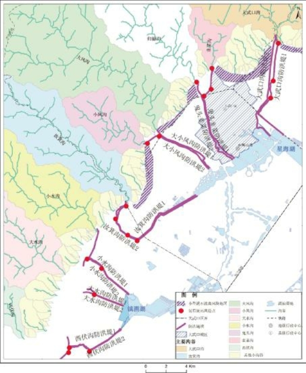 对于该隐患,我们建议开展专门的沿主要防洪堤坝的地质灾害危险性评估和防洪评价,划定地质灾害高风险区。对其威胁对象进行分类,对于高风险威胁对象建议搬迁避让或者建立预警机制,将高风险区划为限制建设区,并在汛期进行定期巡查防洪堤坝,防止泄洪道被堵或者防洪堤被毁等情况出现(图10-6)。