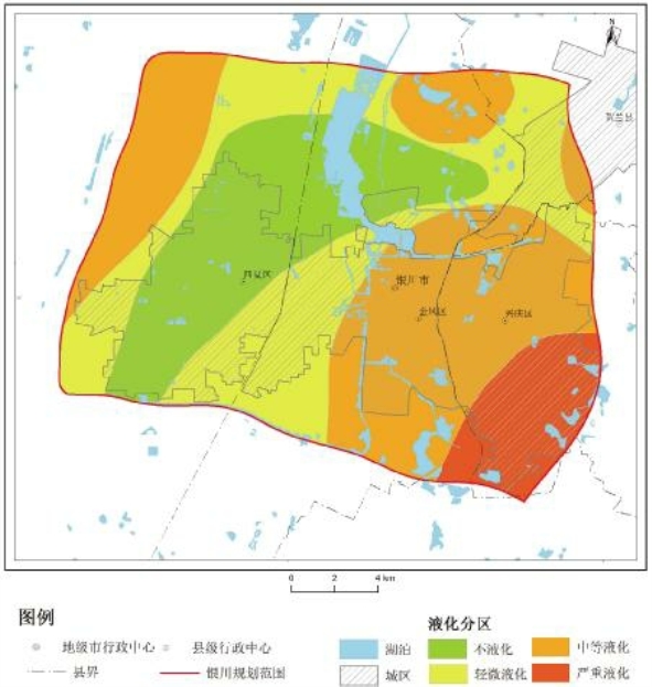 石嘴山砂土液化区主要分布在洪积倾斜平原与冲湖积平原交界地带,由南部崇岗沿着地貌分界地带,经星海湖一直到明水湖农场一带。南部一带为轻微液化,明水湖一带为中等液化,液化最大深度为16 m。该区地处地貌交界地带,搬运与沉积作用强烈,在沉积了大量的粉土和粉细砂的同时,部分原有松散沉积物被搬运走,反复出现沉积与搬运,致使这些土体沉积固结较差,同时这一带地下水径流受阻,水位抬升,地下水浅埋,故这一带出现砂土液化现象。