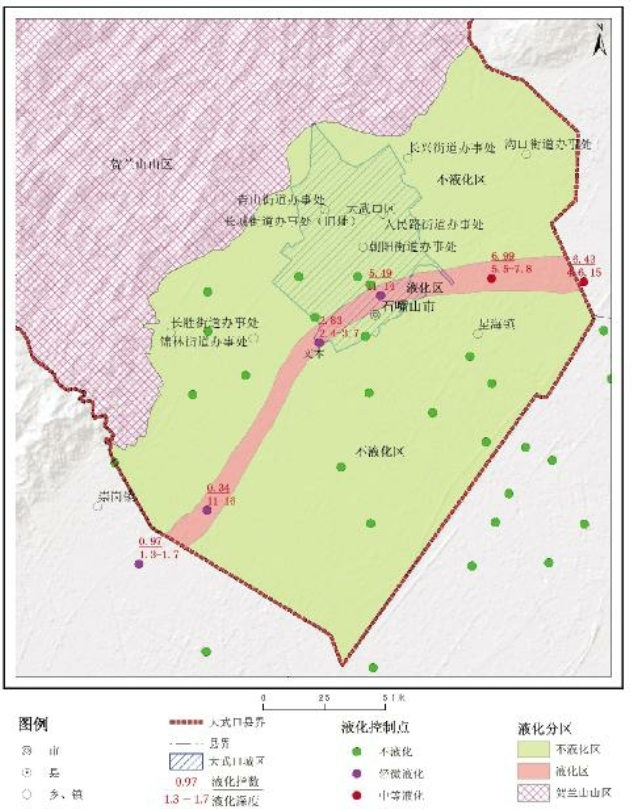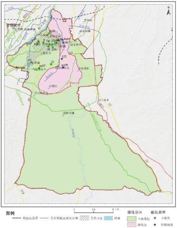 根据本次工程地质钻探和前人资料收集,共在19个控制点进行地震砂土液化分析,其中中等液化点1个,轻微液化点3点,不液化点15个,液化深度4.9~6.0 m(图11-5)。