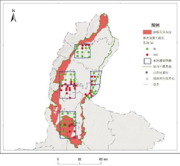 贺兰山东麓洪积斜平原砂砾石层:沿贺兰山东麓分布,北起红果子火车站,南至永宁窦家圈,南北延长120 km,南宽北窄,园艺场(大水沟南)以南宽8~10 km,以北宽3~4 km。岩性总体来说横向自西向东由粗变细,由块石、卵砾石、砂砾石变为砂砾石夹砂层。