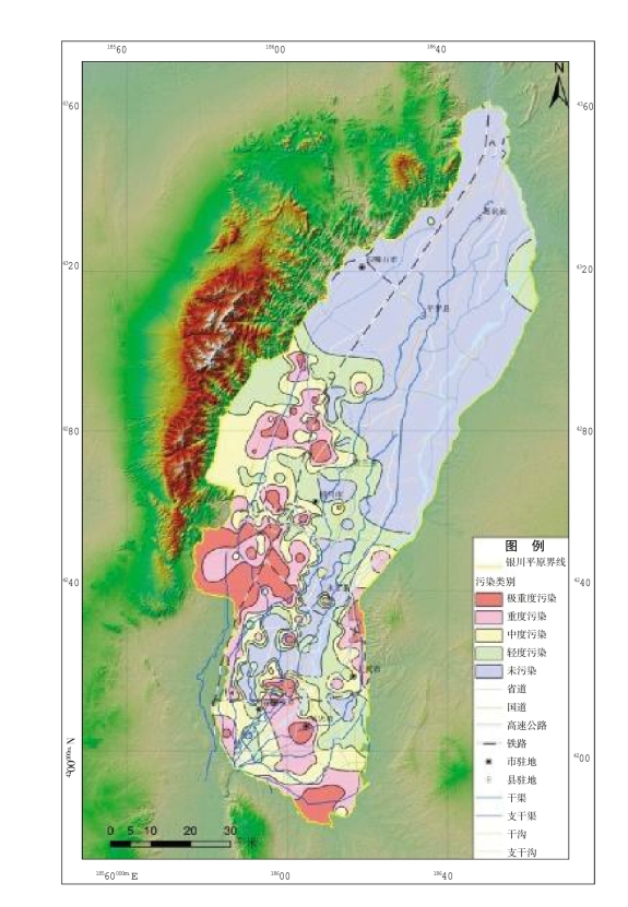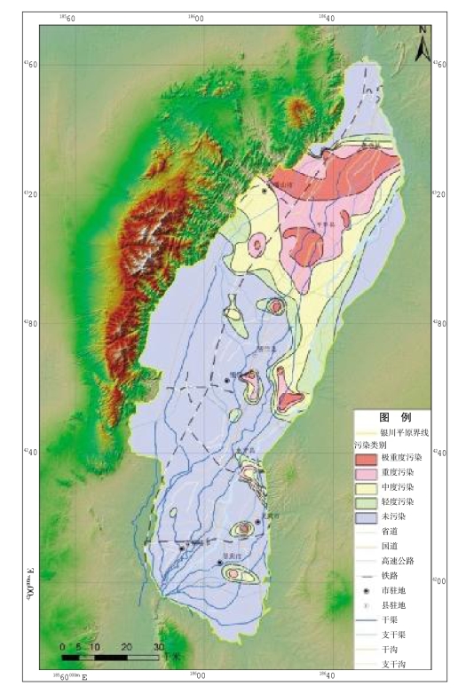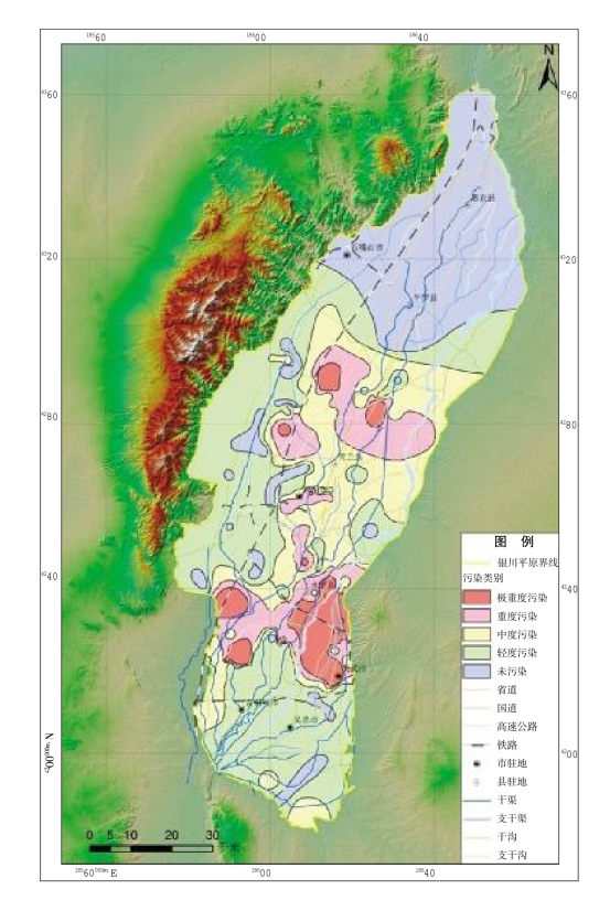 银川平原中、重污染区大多分布于北部地区的石嘴山市,零星分布于银川市及吴忠市局部地段,具有沿区域地下水流方向由南向北逐渐增多、污染程度逐渐加重的趋势。结合地下水流系统分析认为:地下水流系统的分布特点与地下水更新速率有着密切的联系。平原南部吴忠市,地下水径流条件好,地下水更新速度快,水交替作用强烈。因而当地下水遭受工业及生活污水的污染时,能迅速淡化或排向下游。北部石嘴山市作为地下水径流的滞缓区,地下水径流条件差,更新速度慢,水交替作用缓慢,因而当地下水遭受工业及生活污水的污染时,污染物得不到及时的稀释与排放,于地势低洼的地下水滞留地区,即平罗以北地区,逐步由中度污染发展至严重污染,由点状污染扩散到片状污染。