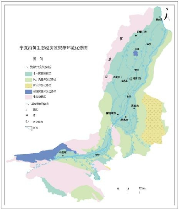 在收集已有资料的基础上,提出了沿黄生态经济区的资源环境优势区主要包括:水土资源匹配区、矿产资源开发优势区、风能太阳能等清洁能源开发优势区、旅游资源开发优势区、生态环境保护区等五大优势区,其面积分别为9210 km2、1933 km2、6049 km2、1035 km2、4852 km2(表15-1、15-1)。通过对沿黄经济区国土空间开发利用优势进行分区划分,为国土空间适宜性以及三类空间划分提供基础资源环境数据支撑。