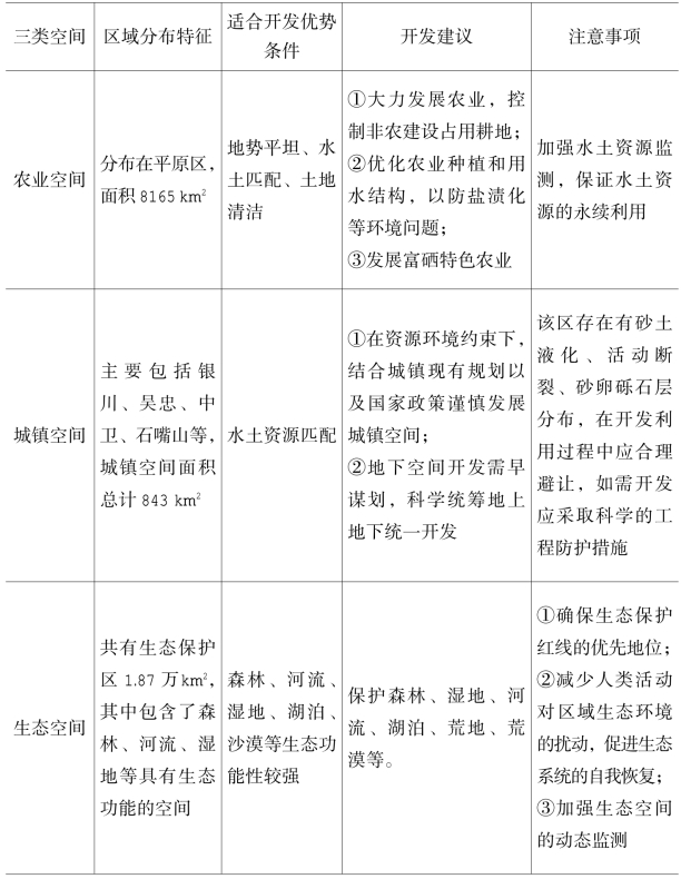 城镇空间包括银川、吴忠、中卫、石嘴山等几个城市及县城镇政府所在地,总共城镇空间面积843 km2。城镇空间内水土资源匹配较好,在空间规划中应坚持在资源环境约束下,结合城镇现有规划以及国家政策谨慎发展城镇空间;地下空间开发需早谋划,科学统筹地上地下统一开发。该区存在有砂土液化、活动断裂、砂卵砾石层分布,在开发利用过程中应合理避让,如需开发应采取科学的工程防护措施。