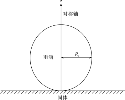 雨滴和土壤表面的碰撞过程被简化为单个雨滴与无限质量平面刚体的碰撞(见图1-2)(Huang, et al., 1982, 1983)。前人分别采用Navier-Stokes方程和弹性力学模型来模拟碰撞过程中雨滴表面的速度场和压力场的变化(Huang, et al., 1982)及雨滴碰撞载荷下刚体表面的垂向和径向的变形(Huang, et al., 1983)。