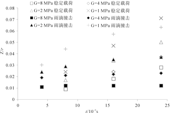 图1-3 基于弹性力学数值计算的稳定载荷和雨滴撞击下模拟的土壤垂向(轴向)压缩过程中无量纲位移的变化(据文献(Huang et al.(1983))表1和表2数据绘制,G为杨氏模量,单位MPa)