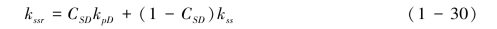 和前人研究相比较,Kinnell(2005)模拟研究强调了来自上坡向或临近单元溅蚀分离的松散颗粒物质沉积对计算单元内下层土壤溅蚀的保护效应,即预先溅蚀分离物质沉积层(Layer of pre-detached material)对土壤溅蚀可蚀性及输送强度的抑制。为了定量描述预先分离沉积层对土壤溅蚀可蚀性的影响,kssr可被表示为式(1-30):