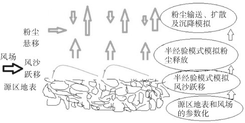 尽管边界层气流可以直接卷吸地表粉尘进入大气之中(Shao & Klose, 2016; Wang,2016),但粉尘颗粒很少是分散地存在于表土之中。由于细颗粒之间黏滞力,粉尘主要以土壤团聚体存在,风蚀粉尘释放主要是以跃移颗粒撞击为条件(Shao, et al.,1993; Alfaro, et al.,1997),因而粉尘释放模拟是以跃移输送模型为基础,如Gillette & Passi(1988)模型,美国EPA粉尘释放模型(OAQPS,1977; Cowherd, et al.,1979),邵亚平粉尘释放模型(Shao,et al.,1996, 2001; Lu & Shao,1999)和DPM 粉尘释放模型(Marticorena& Bergametti,1995, Marticorena, et al., 1997; Alfaro,et al., 2001)等。沙尘天气的预报模式也是在模拟跃移通量基础上来预测粉尘释放、输送和沉积(图2-1)。