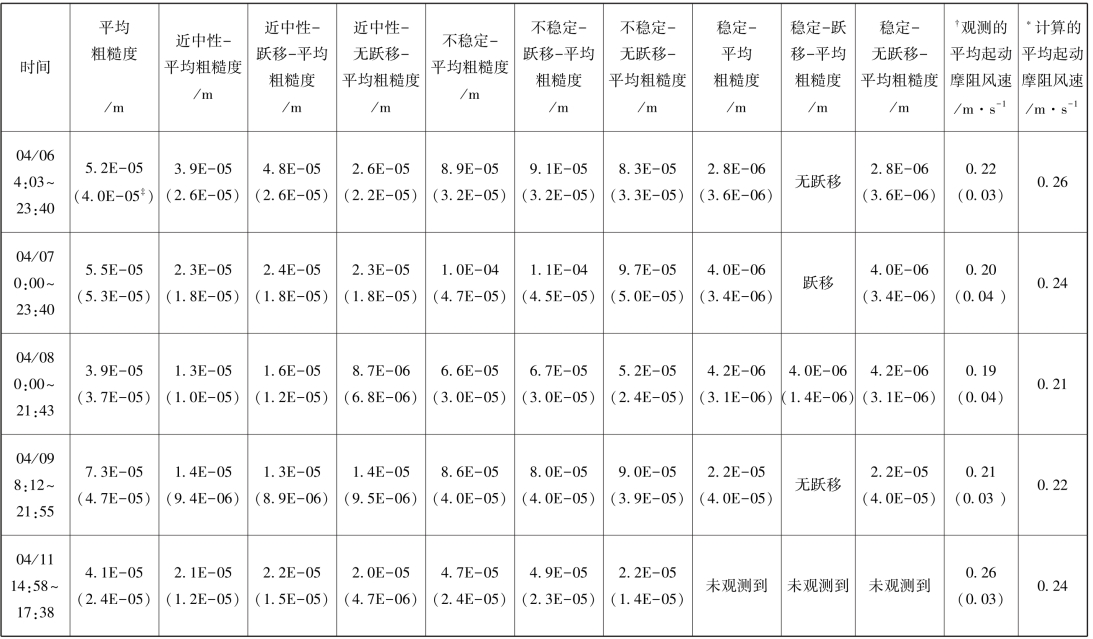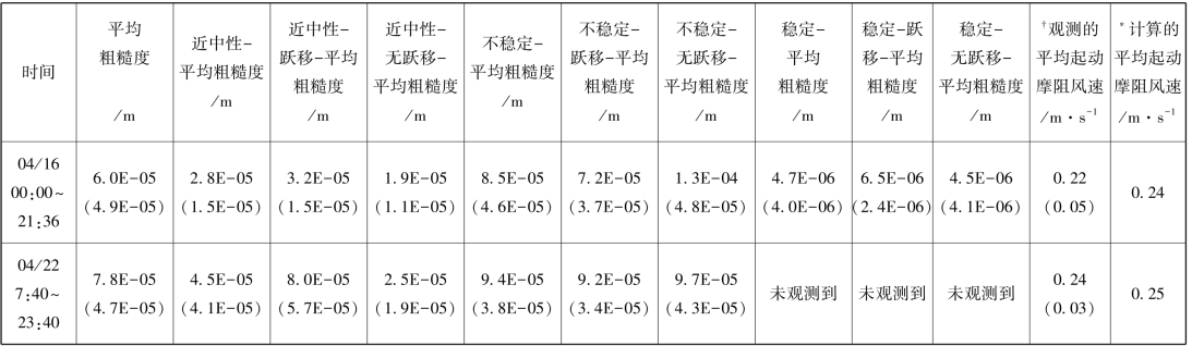 表3-1 风蚀观测期间日均的不同动力状况和热力状况下的空气动力学粗糙度及观测的平均起动摩阻风速(梅凡民等,2006)