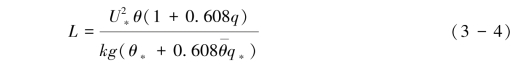 其中U(z), U∗, k,Z0, L分别为风速、摩阻风速、卡门常数、空气动力学粗糙度和莫宁-奥布霍夫长度。莫宁-奥布霍夫长度计算式为式(3-4):