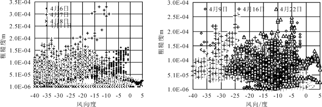 同一稳定度下,观测的空气动力学粗糙度也存在明显的变化(见图3-3),如4月7日,当Ri=-0.10,风向在-15°左右,空气动力学粗糙度在2~3.5×10-4 m,同样地,其他观测日也存在稳定度和风向相近的情况下,空气动力学粗糙度也存在明显的差异,对此可以从空气动力学因素分析其对空气动力学粗糙度的影响。