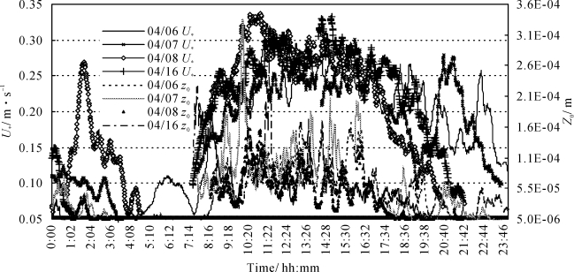 除空气动力学粗糙度随风向变化外,在同一风向的条件下,同一个观测日的不同时刻和不同的观测日的粗糙度也存在着明显的变化,其在10-6~3.5×10-4 m之间变化。对于这类变化,需要从热力因素和动力因素方面寻求答案。