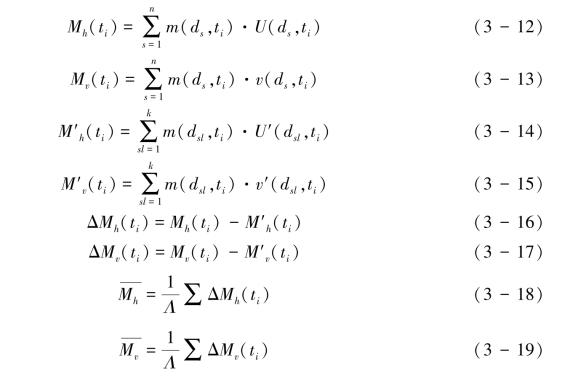 据式(3-6),ti时刻风沙两相流达到平衡状态,沙粒起跳可看作是典型冲击起动,设撞击颗粒群中粒径为ds颗粒的质量、水平速度和垂直速度分别m(ds),u(ds),v(ds),则撞击沙粒群的水平动量Mh(ti)和垂直动量Mv(ti)分别为式(3-12)和式(3-13),起跳沙粒粒径为dsl颗粒的质量、水平速度和垂直速度分别m(dsl),u′(dsl),v′(dsl),相应的水平动量M′h(ti)和垂直动量M′v(ti)分别为式(3-14)和式(3-15),令沙粒群碰撞过程水平动量损失ΔMh(ti)和垂直动量损失ΔMv(ti)分别为式(3-16)和式(3-17)。设风沙两相流输运的动态演化时间T内,所有典型冲击起动阶段对应的平均水平动量和垂直动量损失Mv分别为式(3-18)和式(3-19),其中Λ为时间T内纯粹冲击起动事件的次数。