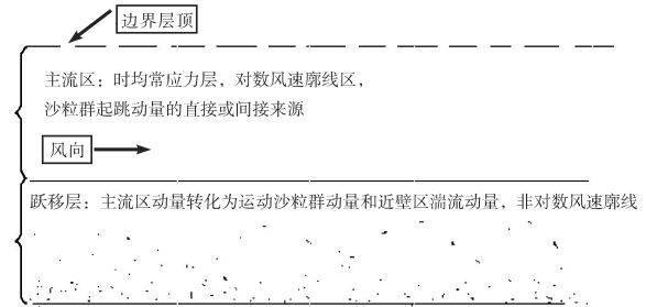 根据流体力学的边界层理论和风沙两相流输运的规律,把实验风洞的风沙边界层自床面以上依次划分为边壁区、跃移层和主流区(见图3-6)。风沙边界层内的边壁区是沙粒群浓度最大、速度最小和气流流速最小的区域,这里汇集了大量的蠕移颗粒和低速的跃移颗粒,同时也是湍流相干结构发生、发展和消亡的区域,整个跃移层内由于大量运动沙粒群吸收了湍流动量,风廓线偏离对数律;主流区是风沙两相流动量直接或间接来源,风速廓线服从对数律。