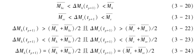 若tp时刻边壁区动量满足τa(tp)>ρ·t,且边壁区动量增加随机脉动所引起,则tp+1时刻必然会有部分沙粒被气流直接拖曳而起跳,同时有部分沙粒被其他沙粒冲击而起跳,而整个起跳的沙粒群究竟是以普通的空气动力学起动为主还是以冲击起动为主,需要利用沙粒群碰撞过程的动量损失来区分。这里把tp+1沙粒群的水平动量损失ΔMh(tp+1)和垂直动量损失ΔMv(tp+1)与典型冲击起动和空气动力学猝发起动对应的平均动量损失做比较,会存在式(3-20)和式(3-21)的关系。若ΔMh(tp+1)和ΔMv(tp+1)满足式(3-22),则定义沙粒起动以冲击起动为主;若满足式(3-23),则定义沙粒起动以普通空气动力学起动为主;若满足式(3-24),则定义沙粒起动普通空气动力学起动+冲击起动。