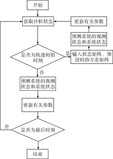 卡尔曼滤波的算法流程包括构建沙粒状态转移矩阵、观测矩阵、系统预测噪声斜方差矩阵、观测噪声协方差矩阵(见图4-8)。通过多步预测和多步测量来不断优化预测和观测的协方差矩阵,从而有效控制沙粒位置预测和测量的误差直到追踪结束。