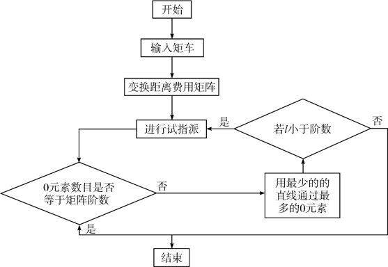 匹配方案选优流程见图4-9:①对矩阵费用进行变换,将代价矩阵中的每一行减去该行的最小值,每一列减去该列的最小值;②进行试指派,找出独立的0元素,该操作包括距离费用矩阵的每一行,对有且仅有一个0元素所在行对应的零元素画“○”。然后将“○”所在列的其他0元素划去,记作“ø”;从只有一个0元素的列开始(画“ø”的列不计),对该列中的0元素画“○”,然后将“○”所在行的其他0元素划去,记作“ø”;若依然没有画“○”的元素,且同行(列)的0元素至少有两个,比较该行各元素所在列中0元素的数目;选择数目少的画“ø”,然后将同行同列中其他0元素划去;如果矩阵中画“○”的个数等于矩阵的阶数则矩阵中所有画“○”的0元素所对应的行数和列数即为轨迹和沙粒所对应的编号,此时分配已经结束;若画“○”个数与矩阵阶数不相等则重复前面的步骤;③对距离费用矩阵中的0元素用最少的直线进行覆盖,包括对没有“○”的行上画“√”;对画上“√”行中0元素所在的列画上“√”;将画上“√”的列中所有“○”所在的行画上“√”;将距离费用矩阵中未标记“√”的行画上横线,对标记上“√”的列画上竖线,直到矩阵中所有的0元素被覆盖,将覆盖的所有0元素的直线个数记作l,若l小于矩阵阶数则进入第④步;④变换矩阵以添加0元素个数,在没有直线通过的所有元素中找出最小值,没有直线通过的元素减去最小值,直线交点处的元素加上最小值,然后转到第②步。
