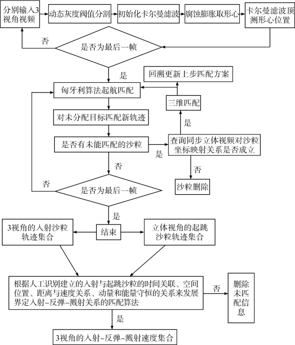 和传统的PTV算法相比较,新算法增加了入射与起跳沙粒轨迹筛选、入射-反弹-溅射关系筛选及匹配模块,可实现从三维视角提取、分析粒-床碰撞信息。