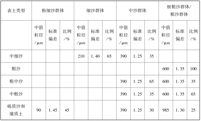根据实测表土微团聚体粒度分布特征,可对不同表土类型的粒度分布特征作参数化处理,即根据表土粒度分布对数正态分布总体及其组合来模拟风蚀粉尘源区表土微团聚体的粒度分布特征(见5-3),此参数化方案是本章粉尘释放模拟的输入参数。