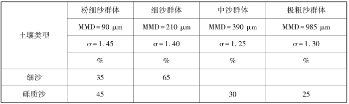 阴山以北干草原农垦区的南部为干燥剥蚀的低山丘陵,北部为层状高平原地区(中国科学院内蒙古宁夏综合考察队, 1978;内蒙古自治区资源系列地图编辑委员会, 1992),除季节性河流两岸有一些冲洪积物外,表土组成物质主要白垩系、第三系为沙砾岩、泥岩、沙岩的风化残积物,花岗岩、玄武岩、片麻岩等的坡积物、残积物,另外有零星分布的沙质黄土。风化残积物、坡积物为细小的砾石、沙、粉沙和黏土的混合物,大小颗粒混杂,分选性差。故采用3个对数正态分布群体的叠加来模拟表土微团聚体分布,其质量中值粒径分别为985μm,390μm和90μm(见表5-5),由于过度放牧和气候波动等原因,草原牧区出现了严重的沙漠化,土壤风蚀加剧(朱震达, 陈广庭, 1994;王涛等,2003),表土物质在风蚀的过程中发生了砾质化和沙化,一部分细沙和中沙被风搬运、沉积,离开了原来的位置,表土出现沙化的特征,而砾石在土壤表面聚集出现砾质化现象。阴山南部的干草原经过近代的开垦后耕地出现了严重风蚀(朱震达,陈广庭,1994;董治宝,陈广庭,1997;王涛,2003),开垦耕地出现面上风蚀、沙质化和砾质化等3种形式。