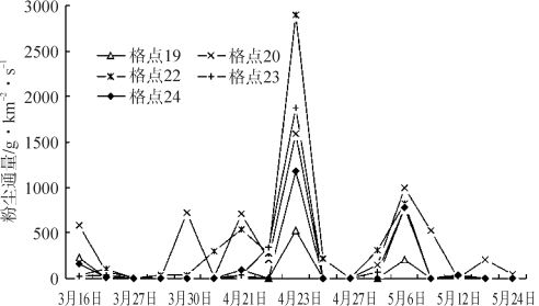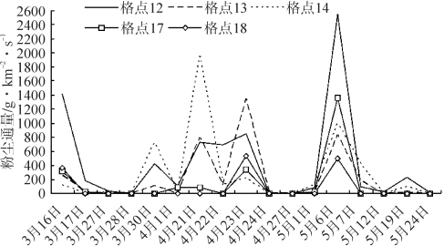 一个有趣的结果是沙漠中心网格点的粉尘释放通量低于周围沙漠-戈壁交接地带,如网格点17~19低于12,14,20,22等,后者是前者的几倍到几十倍,其主要是由于沙漠边缘地带的摩阻风速高于沙漠中心地区。由此可见,研究区域粉尘释放过程中,风动力条件的影响超过了地表条件的作用。