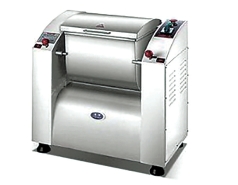卧式和面机的搅拌容器轴线与搅拌器回转轴线都处于水平位置,其结构简单,造价低廉,卸料、清洗、维修方便,可与其他设备完成连续生产,但占地面积较大。这类机器生产能力(一次调粉容量)容量大,通常为25~400 kg/次。它是各食品厂大量生产应用最广泛的一种和面设备。