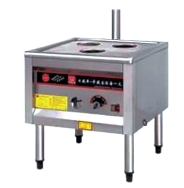 蒸煮炉(即传统上是火蒸煮灶)是利用煤或柴油、煤气等能源的燃烧而产生热量,将锅内水烧开,利用水的对流传热作用或蒸汽的作用使生坯成熟的一种设备。现在大部分饭店、宾馆多用煤气灶,主要是利用火力的大小来调节水温或蒸汽的强弱使生坯成熟。它的特点是适合少量制品的加热。在使用时一定要注意规范操作,以确保安全。
