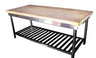 其台面大多用6~10 cm厚的木板制成,底架一般有铁制的、木制的几种。台面的材料以枣木为最好,柳木次之。案台要求结实、牢固、平稳,表面平整、光滑、无缝。此为传统案台。