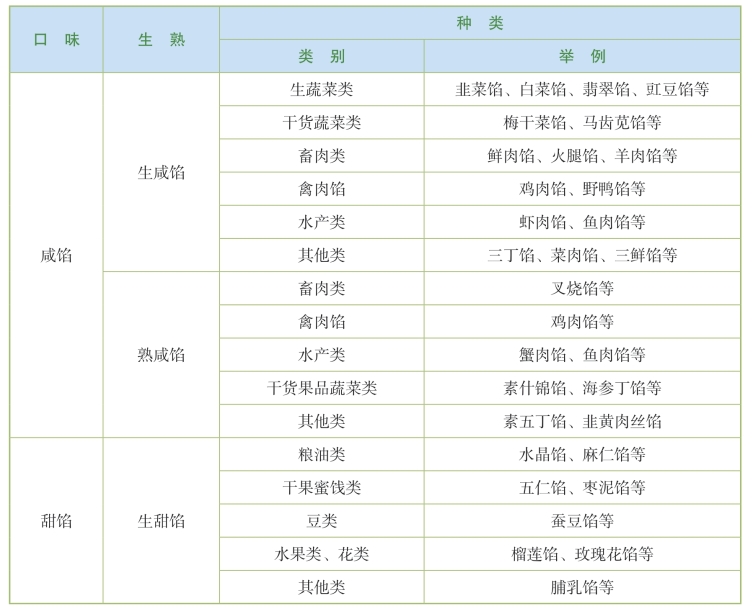 按原料分类,可分为荤馅、素馅、荤素馅3大类;按口味分类,可分为甜馅、咸馅和甜咸馅3类;按制作方法分类,可分为生馅、熟馅两种。