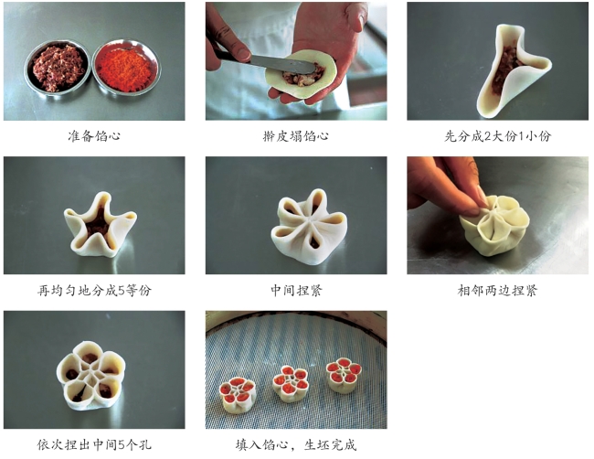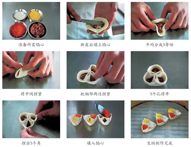 ③捏制一品饺时注意孔洞呈品字形,大小要均匀相等。