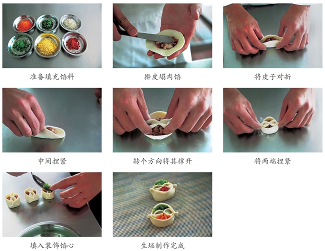C.在皮子光的一面上10 g馅心,再将坯皮对折,将两侧收口后捏紧,并用右手食指和拇指依次从上至下双推出花边。