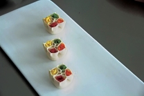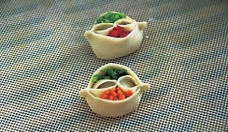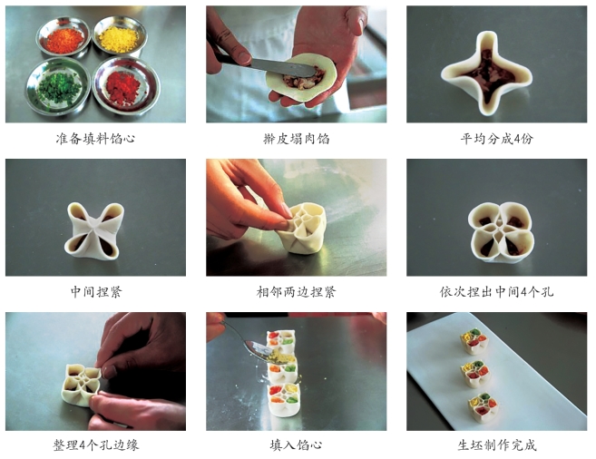 F.在5边斜孔中分别填入5种不同色彩的馅料末即成兰花饺生坯。