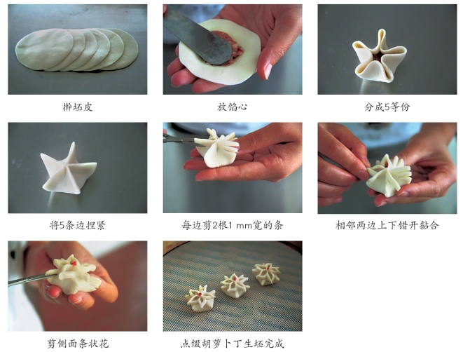 ②面团软硬适中,太软造型容易塌陷变形,制作花式蒸饺面团宜稍硬。
