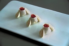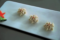 ⑤将内折的皮翻上来,最后在冠顶饺顶部装饰一个小的红樱桃点缀即成冠顶饺生坯。