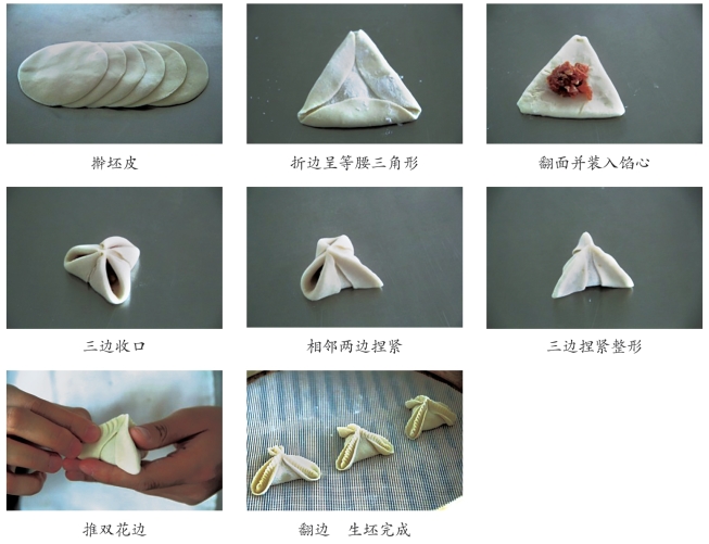 通过对冠顶饺的学习,掌握折捏类花式蒸饺的制作手法,学习等边三角形的三边折捏以及最后成形的翻边技巧。