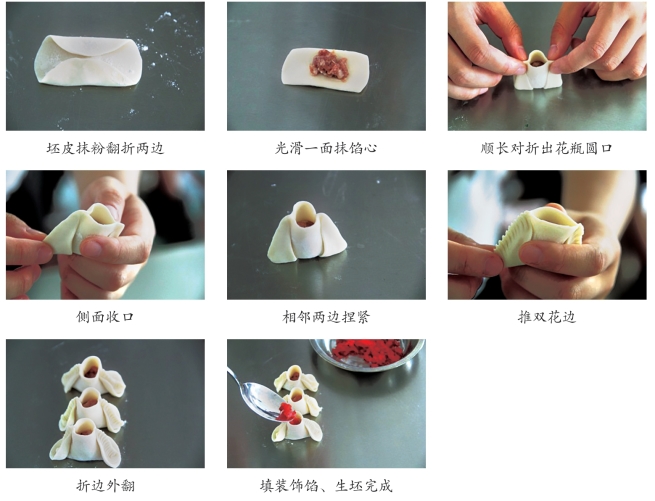 D.分别将内折的皮翻上来,最后在花瓶饺瓶口部放蛋黄末或者胡萝卜粒作装饰,即成花瓶饺生坯。
