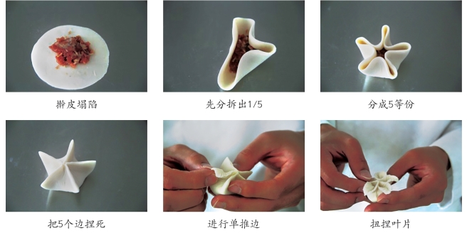 花式蒸饺一般都采用“捏”法成形。在面点成形方法中,捏制是比较复杂、花色最多的一种成形方法。通过对鸳鸯饺的学习,学会叠捏的成形技巧,掌握如何将皮子二等分的技能。