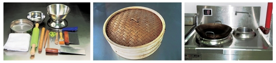 图4.1 刮板、面筛、毛巾、刀、保鲜膜、盆、电子秤、蒸笼、炉灶等