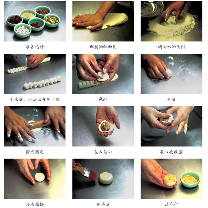 ①调制水油皮、油酥面团时,准确掌握面粉与猪油比例。