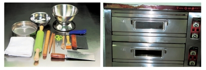 图8.1 盆、刀、刮板、擀面杖、烤箱、烤盘、电子秤、面筛、保鲜膜、毛巾、毛刷等